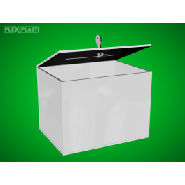 Sbírková kasička, velká rozměry:300 mm délka 300 mm šířka 300 mm výška - je vyrobena z opticky čirého materiálu (plexiskla PMMA). Součástí příslušenství sbírkové kasičky je schránkový či visací zámek a 3 ks čirých pantů.
