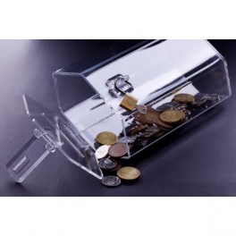 Plastová pokladnička200 x 150 x 150 mm (d x š x v) vyrobena z opticky čirého materiálu (plexiskla)- pokladnička je osazena čirými panty a dle výběru zákazníka schránkovým nebo visacím zámkem.