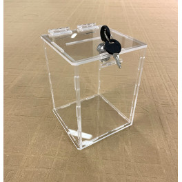 Plexisklová kasička, vysokározměry: 150 x 150 x 400 mm (délka x šířka x výška) materiál: čiré plexisklo minimální síla 4 mm- kasička je osazena plexisklovými panty (2ks) a schránkovým či visacím zámkem s petlicí