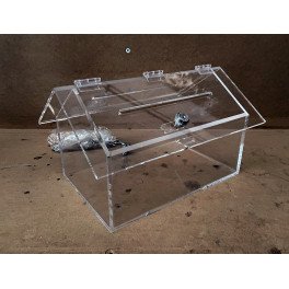 Plastic box200 x 150 x 150 mm (L x W x H) made of optically clear material (plexiglass)- The box is fitted with clear hinges and according to the customer's choice a box or padlock.